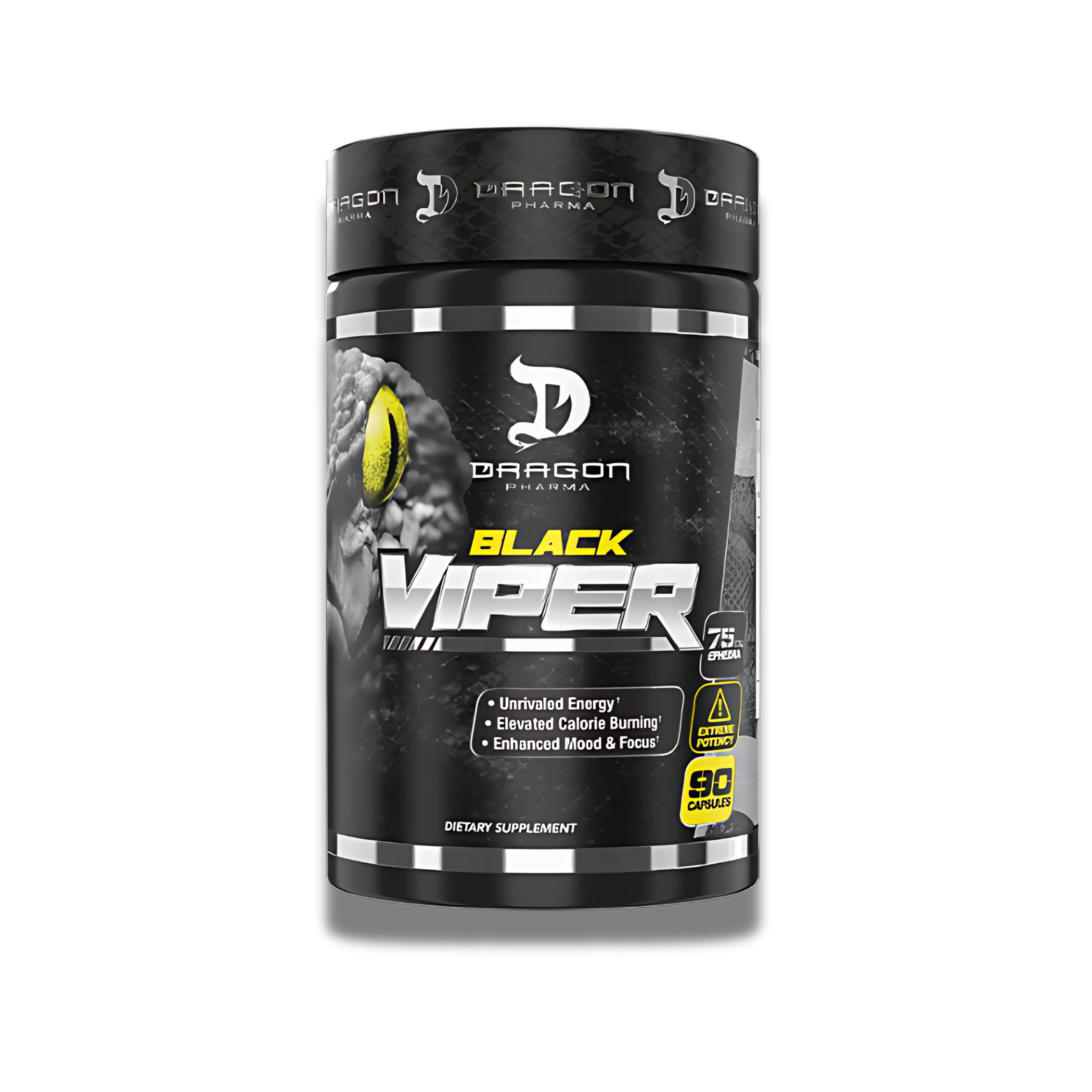 Black Viper de Dragon Pharma formulado con ingredientes de alta intensidad que refuerzan la energía y la concentración de alta intensidad, una mayor quema de calorías y un mejor estado de ánimo, Black Viper® se convertirá rápidamente en un favorito en su arsenal para sus fases de corte.